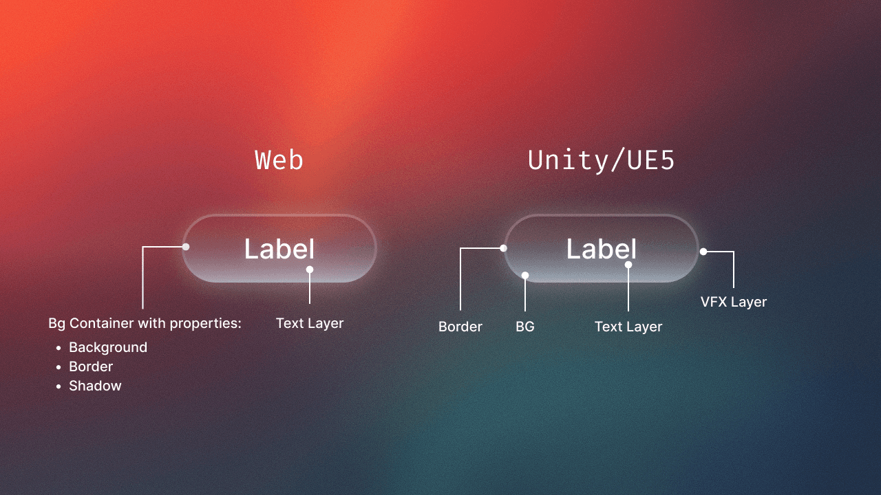 In Unity or Unreal, the same button becomes a multi-layer element with BG, Border, Icon, Label, Hover, Pressed, Focused, Disabled, and sometimes VFX overlays.
