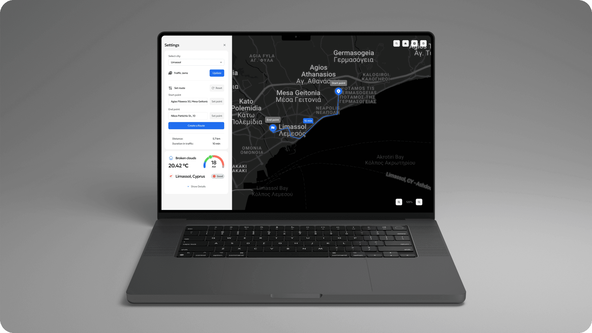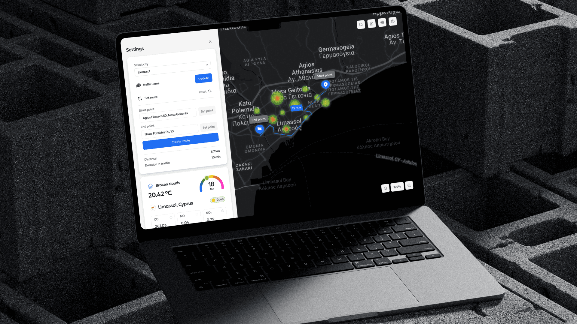 A browser-based 3D urban-digital-twin built with CesiumJS and 3D Tiles. The solution enables city teams to visualise terrain, buildings and live data streams (traffic, air quality, environment) in one unified spatial model