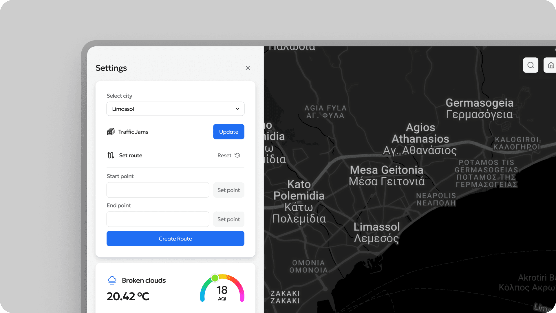 Embedded real-time feeds for traffic, weather, and air quality, displayed directly on the 3D map